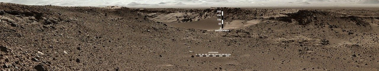 This scene combines images taken by the left-eye camera of the Mast Camera (Mastcam) instrument on NASA's Curiosity Mars rover during the midafternoon, local Mars solar time, of the mission's 526th Martian day, or sol (Jan. 28, 2014). The sand dune in the upper center of the image spans a gap, called "Dingo Gap," between two short scarps. The dune is about 3 feet (1 meter) high. The nearer edge of it is about 115 feet (35 meters) away from the rover's position when the component images were taken, just after a Sol 526 drive of 49 feet (15 meters).