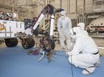 Test operators in a clean room at NASA's Jet Propulsion Laboratory, Pasadena, Calif., monitor some of the first motions by the robotic arm on the Mars rover Curiosity after installation in August 2010. This photo, taken Aug. 31, 2010, shows the arm in a partially extended position. The arm has a reach of about 2.3 meters (7.5 feet) from the front of the rover body.