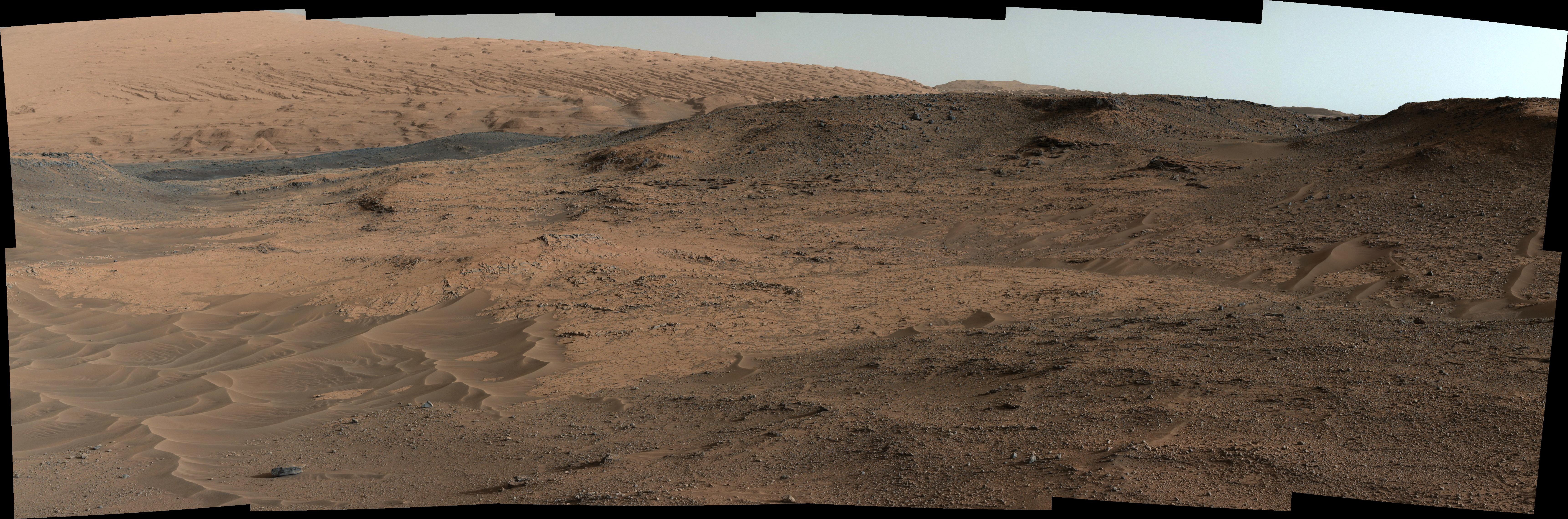 This southeastward-looking vista from the Mast Camera (Mastcam) on NASA's Curiosity Mars rover shows the "Pahrump Hills" outcrop and surrounding terrain seen from a position about 70 feet (20 meters) northwest of the outcrop.