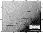 This map shows the route driven by NASA's Curiosity Mars rover from the "Bradbury Landing" location where it landed in August 2012 (the start of the line in upper right) to a major waypoint called "the Kimberley." The rover reached the Kimberley with a 98-foot (30 meter) drive on the 589th Martian day, or sol, of the rover's work on Mars (April 1, 2014).