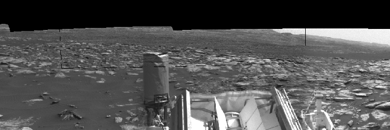 Portions of Curiosity are visible in the foreground. The cylindrical UHF (ultra-high frequency) antenna on the left is used for sending data to Mars orbiters, which relay the data to Earth. The angled planes to the right of this antenna are fins of the rover's radioisotope thermoelectric generator, which provides the vehicle's power. The post with a knob on top at right is a low-gain, non-directional antenna that can be used for receiving transmissions from Earth, as backup to the main high-gain antenna (not shown here) used for that purpose.