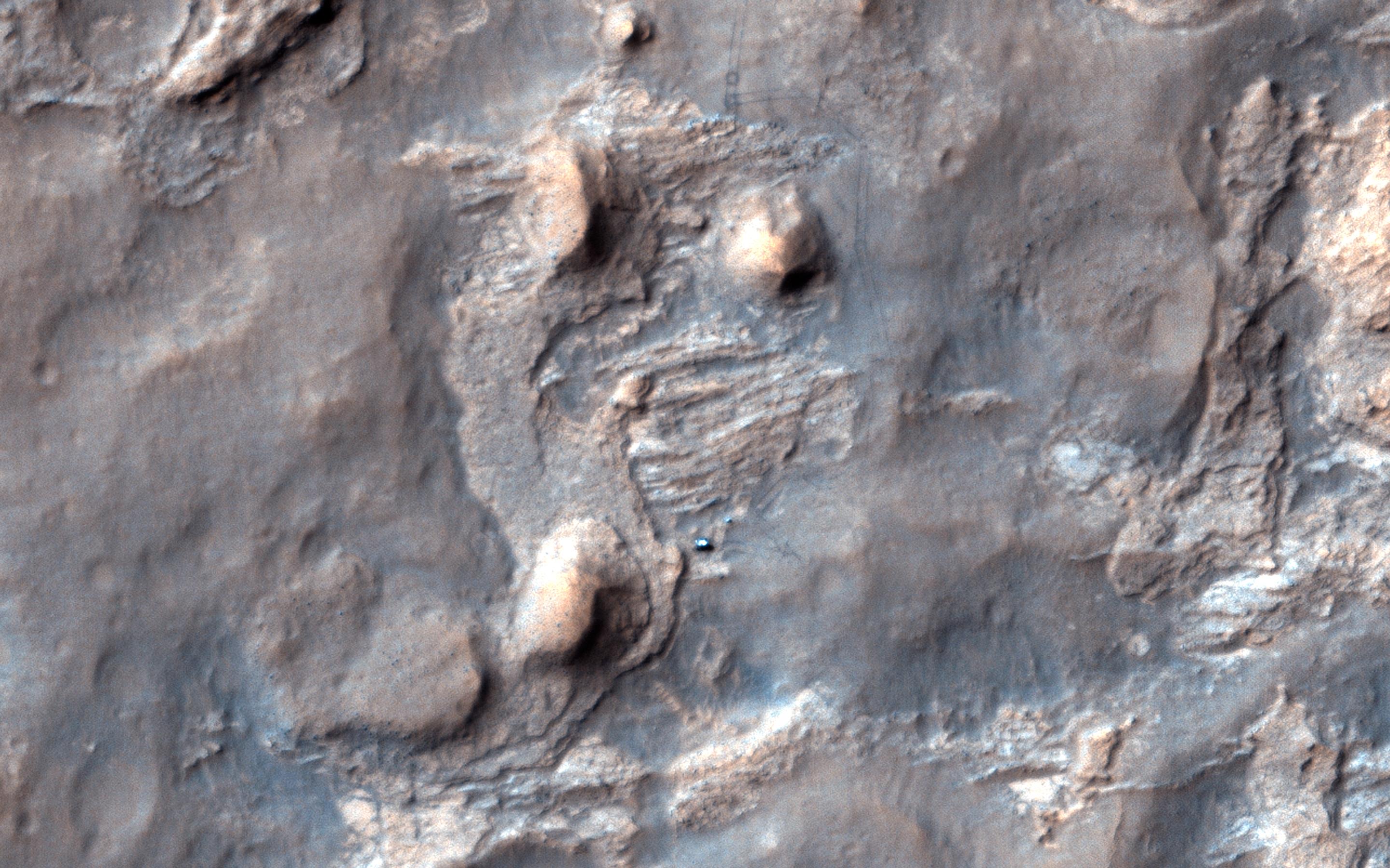 The rover had left Yellowknife Bay and wasn't going to turn around, but similar scarps lay ahead, on the way to Aeolis Mons. Last December they had already chosen their next target-the Kimberley-where they recently arrived, in part because it also has what appear to be geologically young scarps. This new HiRISE image shows the rover approaching one of the scarps. (See also PIA18082, the stereo anaglyph of this site produced from this image by Tim Parker at JPL, and PIA18081.)