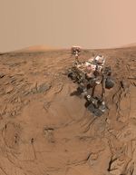 The MAHLI camera is mounted at the end of the rover's robotic arm. The rover self-portrait view from stitching together multiple images does not include the rover's arm. Wrist motions and turret rotations on the arm allowed MAHLI to acquire the mosaic's component images. The arm was positioned out of the shot in the images, or portions of images, that were used in this mosaic. This process was used previously in acquiring and assembling Curiosity self-portraits taken at sample-collection sites, including "Bagnold Dune Field" (PIA20317), "Rocknest" (PIA16468), "Windjana" (PIA18390) and "Buckskin" (PIA19807).