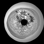 This warped view is different than the color selfies Curiosity has taken in the past using the camera on the end of its robotic arm, called the Mars Hand Lens Imager, or MAHLI. With its arm acting as a kind of selfie stick, Curiosity can show more of its body and surroundings.