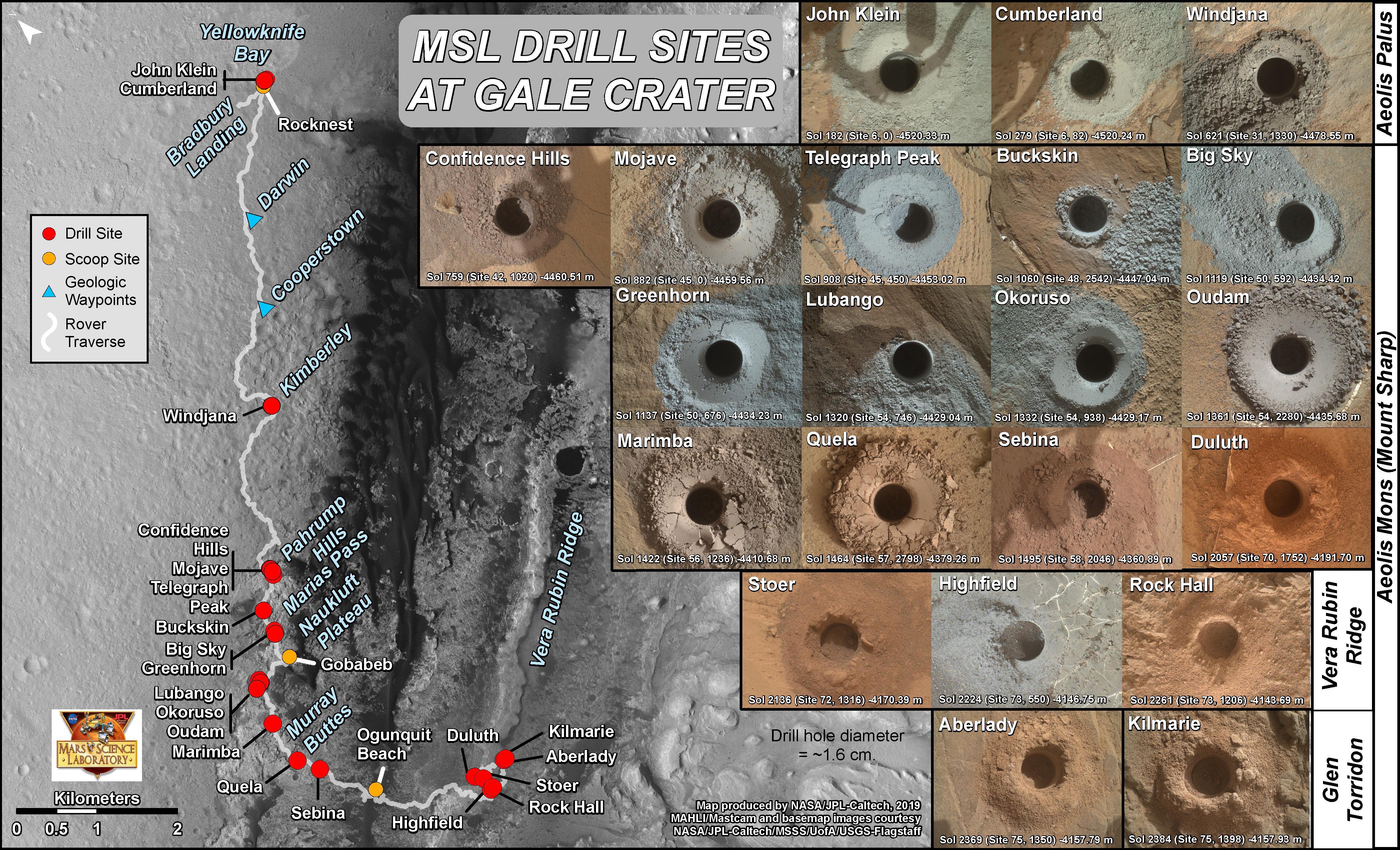 This graphic maps locations of the sites where NASA's Curiosity Mars rover collected its rock and soil samples for analysis by laboratory instruments inside the vehicle. It also presents images of the drilled holes where 21 rock-powder samples were acquired.