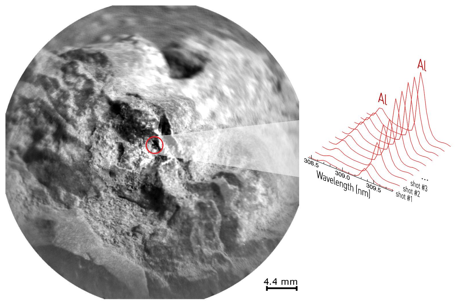 The graph at right show the brightness of the resulting spark at a range of wavelengths detected from each of the first 10 laser shots out of 100 total shots fired at the same point on the rock. The initial shots generated less brightness at a wavelength that is diagnostic for aluminum content, compared to shots after the dust coating on the rock had been cleared away by those first few shots.