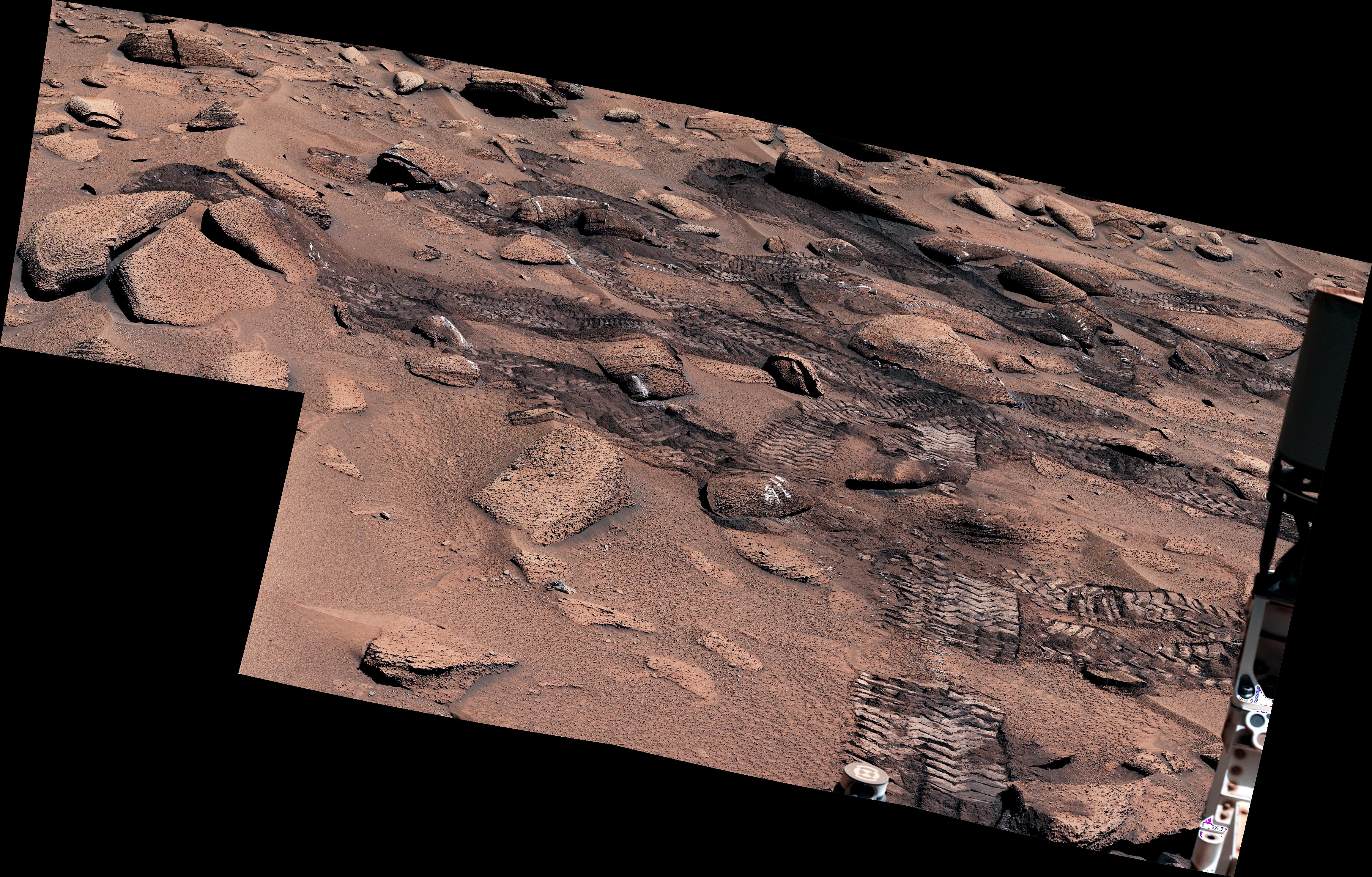 NASA's Curiosity Mars rover left these tracks after trying multiple times to crest a slippery slope. This mosaic, made up of seven images that were stitched together after being sent back to Earth, was captured by the rover's Mastcam on June 13, 2023, the 3,858th Martian day, or sol, of the mission. The color has been adjusted to match lighting conditions as the human eye would see them on Earth.