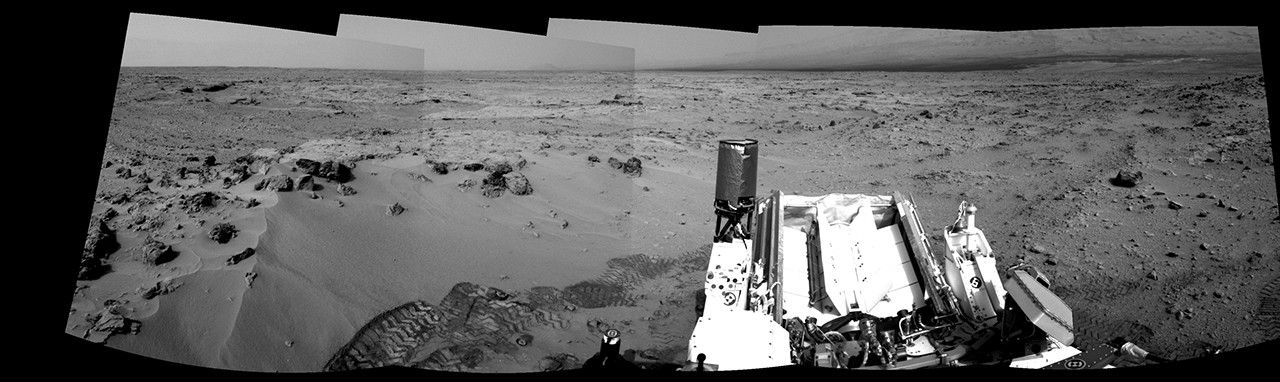 NASA's Mars rover Curiosity drove 6.2 feet (1.9 meters) during the 100th Martian day, or sol, of the mission (Nov. 16, 2012). The rover used its Navigation Camera after the drive to record the images combined into this stereo, panoramic view.