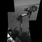 The extended robotic arm of NASA's Mars rover Curiosity can be seen in this mosaic of full-resolution images from Curiosity's Navigation camera (Navcam). Curiosity extended its arm on Aug. 20, 2012.