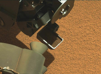 This video clip shows the first Martian material collected by the scoop on the robotic arm of NASA's Mars rover Curiosity, being vibrated inside the scoop after it was lifted from the ground. The rover's Mast Camera (Mastcam) recorded this activity during the mission's 61st Martian day, or sol (Oct. 7, 2012). The location of the rover for this first scooping is the "Rocknest" patch of windblown sand and dust.