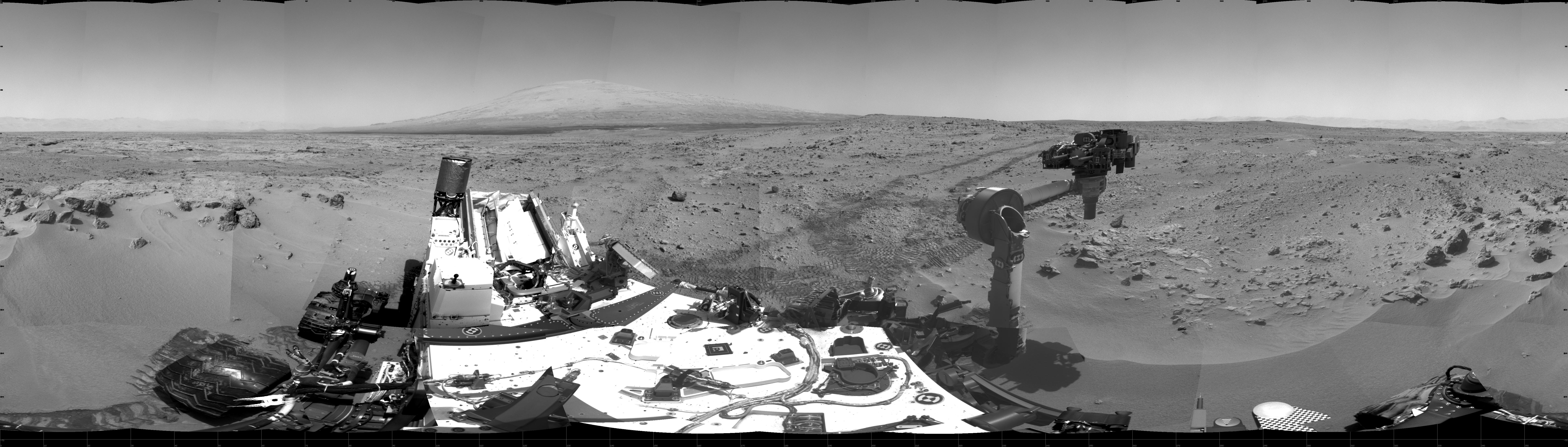 South is at the center of this panorama, north at both ends. Mount Sharp is on the horizon in the southeast. The "Glenelg" area planned as the next destination lies to the east. Tracks that Curiosity's wheels made while driving toward Rocknest recede toward the west. For scale, Curiosity leaves parallel tracks about 9 feet (2.7 meters) apart.