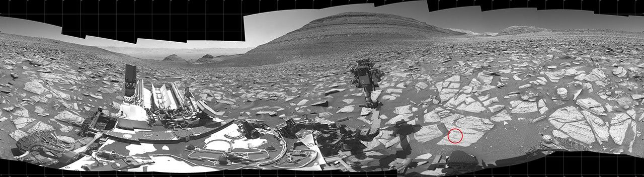 NASA's Curiosity Mars rover captured this 360-degree panorama using its black-and-white navigation cameras, or Navcams, at a location where it collected a sample from a rock nicknamed "Sequoia." This panorama was captured on Oct. 21 and 26, 2023, the 3,984th and 3,989th Martian days, or sols, of the mission.
