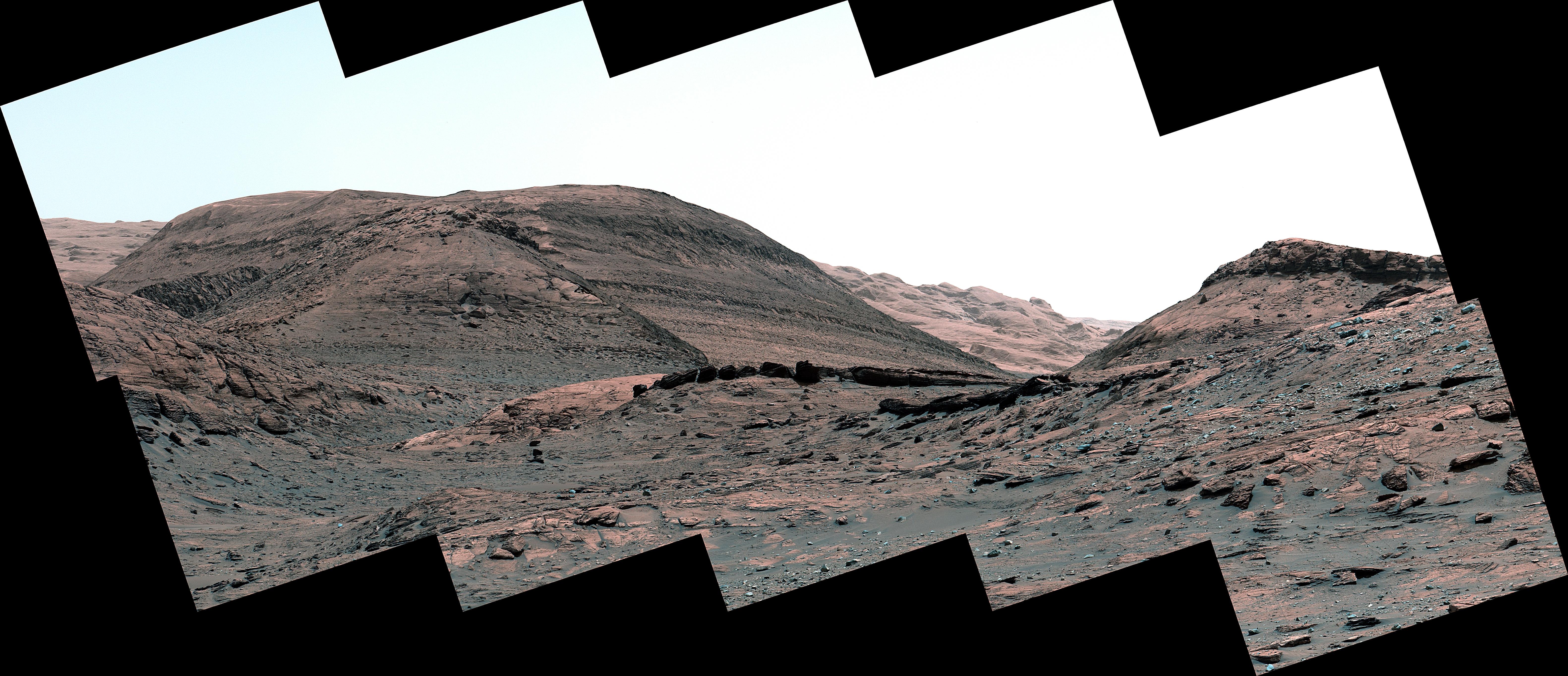 NASA's Curiosity Mars rover captured this view of a sulfate-bearing region ahead of its current location. Dark boulders near the center of the panorama are thought to have formed from sand deposited in ancient streams or ponds. Scattered gray rocks covering the hillside on the right are all that remain of a sandstone capping unit that once covered this area. This panorama is made up of 10 individual images that were captured by Curiosity's Mast Camera, or Mastcam, on May 2, 2022, the 3,462nd Martian day, or sol, of the mission. The images were stitched together after they were sent back to Earth.