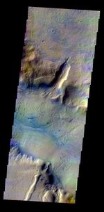 This daytime visible color image was collected on September 4, 2002 during the Northern Spring season in Vastitas Borealis. The THEMIS VIS camera is capable of capturing color images of the martian surface using its five different color filters. In this mode of operation, the spatial resolution and coverage of the image must be reduced to accommodate the additional data volume produced from the use of multiple filters. To make a color image, three of the five filter images (each in grayscale) are selected. Each is contrast enhanced and then converted to a red, green, or blue intensity image. These three images are then combined to produce a full color, single image. Because the THEMIS color filters don't span the full range of colors seen by the human eye, a color THEMIS image does not represent true color. Also, because each single-filter image is contrast enhanced before inclusion in the three-color image, the apparent color variation of the scene is exaggerated. Nevertheless, the color variation that does appear is representative of some change in color, however subtle, in the actual scene. Note that the long edges of THEMIS color images typically contain color artifacts that do not represent surface variation.