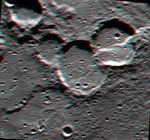 Today's image is located on the western edge of the Rembrandt basin. A scarp cuts right through a pair of older impact craters, leaving them deformed. This image is an anaglyph, which creates a 3D effect when viewed through a pair of red-cyan glass. If you've found a pair of glasses, check out these other 3D views created with MESSENGER images.