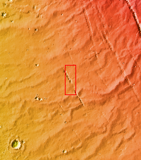 The linear feature in this image is part of Cyane Fossae. The circular collapse features are bounded by linear faults.