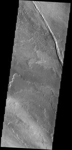 The graben in this VIS image is Cyane Fossae. The lava flows are part of the extensive Tharsis volcanic flows.