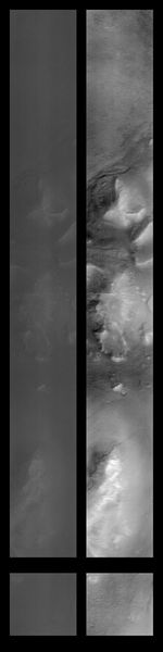 This image is a mosaic of the original data (at left) compared with the results of contrast enhancement (at right). The processing steps performed to create this image were: