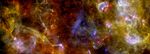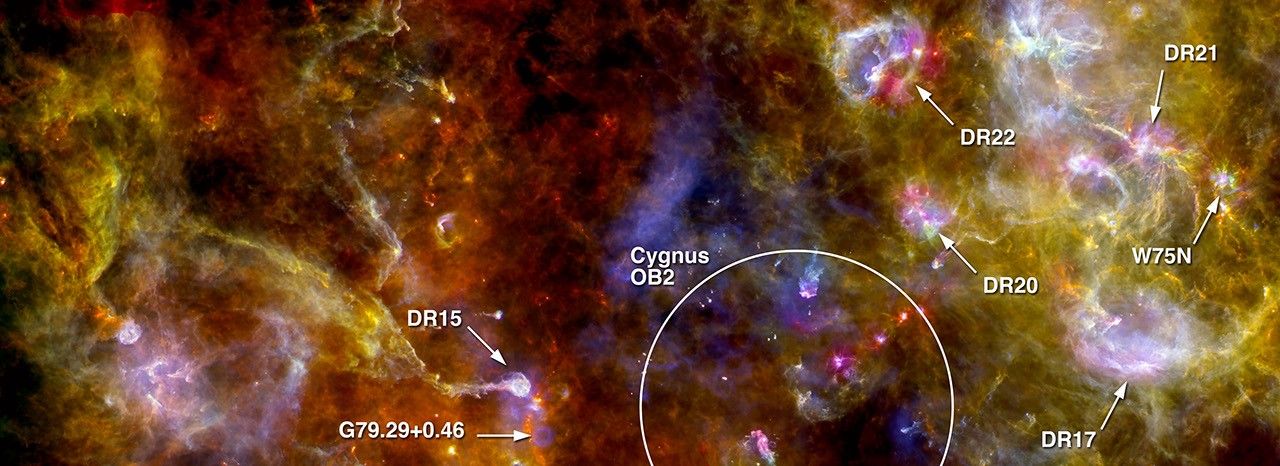 This new view of the Cygnus-X star-formation region by Herschel highlights chaotic networks of dust and gas that point to sites of massive star formation. The image combines far-infrared data acquired at 70 micron (corresponding to the blue channel); 160 micron (corresponding to the green channel); and 250 micron (corresponding to the red channel). The observations were made on May 24, 2010, and December 18, 2010. North is to the lower-right and east to the upper-right.