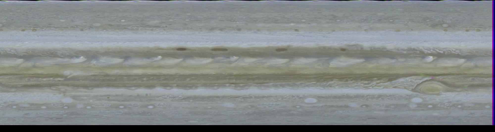 This computer generated map of Jupiter was made from 10 color images of Jupiter taken Feb. 1, 1979, by Voyager 1, during a single, 10 hour rotation of the planet. Computers at Jet Propulsion Laboratory's Image Processing Lab then turned the photos into this cylindrical projection. Such a projection is invaluable as an instantaneous view of the entire planet. Along the northern edge of the north equatorial belt (NEB) are four dark brown, oblong regions believed by some scientists to be openings in the more colorful upper cloud decks, allowing the darker clouds beneath to be seen. The broad equatorial zone (EZ) is dominated by a series of plumes, possibly regions of intense convective activity, encircling the entire planet. In the southern hemisphere the Great Red Spot is located at about 75 degrees longitude. South of the Great Red Spot in the south temperate zone (STeZ) three large white ovals, seen from Earth-based observatories for the past few decades, are located at 5 degrees, 85 degrees and 170 degrees longitude. Resolution in this map is 375 miles (600 kilometers). Since Jupiter's atmospheric features drift around the planet, longitude is based on the orientation of the planet's magnetic field. Symbols at right edge of photo denote major atmospheric features (dark belts and light zones): NTeZ - north temperate zone; NTrZ - north tropical zone; NEB - north equatorial belt; EZ - equatorial zone; SEB - south equatorial belt; STrZ - south tropical zone; and STeZ - south temperate zone. Voyager belt; EZ - equatorial zone; SEB - south tropical zone; Voyager is managed for NASA's Office of Space Science by Jet Propulsion Laboratory.