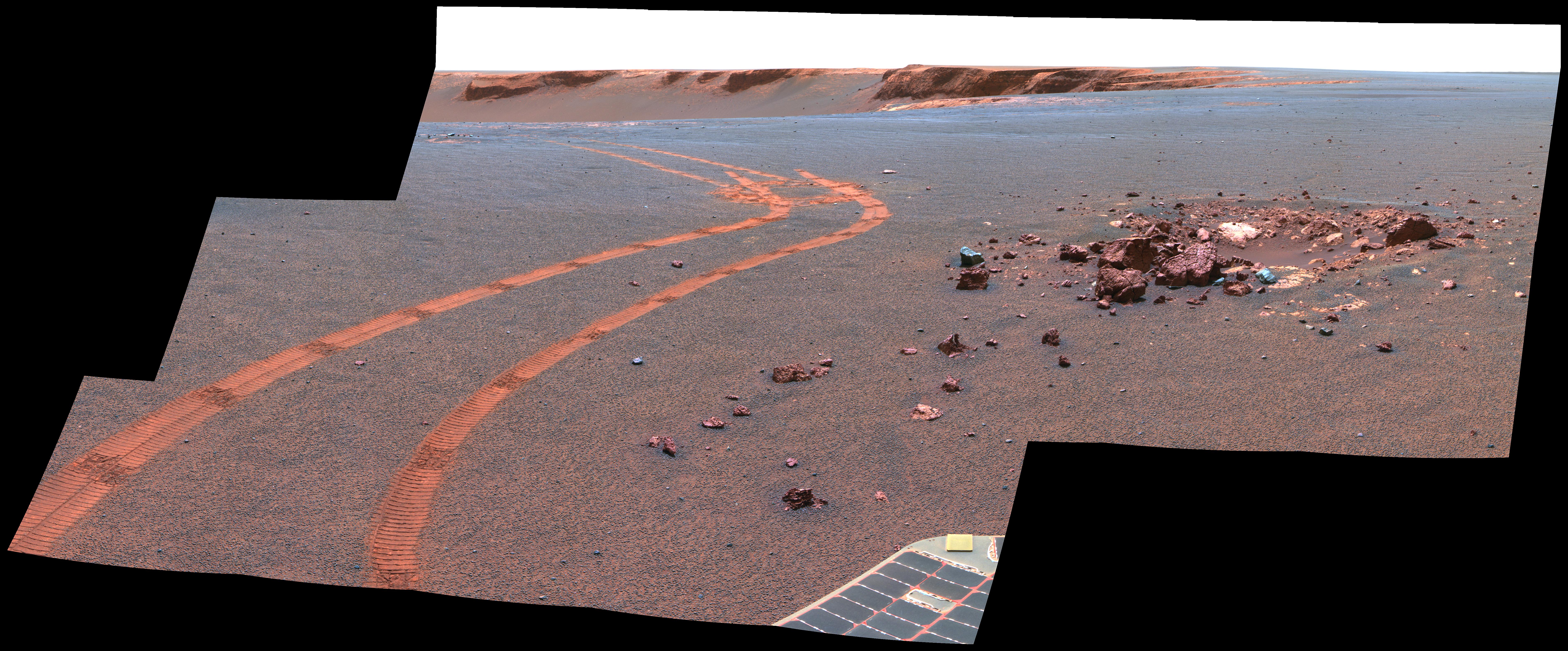 NASA's twin Mars Exploration Rovers have been getting smarter as they get older. This view from Opportunity shows the tracks left by a drive executed with more onboard autonomy than has been used on any other drive by a Mars rover.