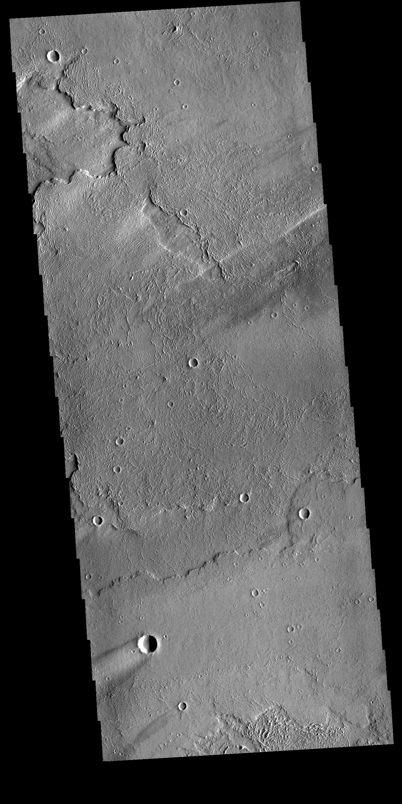 Today's VIS image shows a windstreak on lava plains southwest of Arsia Mons. The extensive lava flow field is called Daedalia Planum. The dark and bright material forming the "tail" behind the crater were created by surface winds funneling over and around the crater. The raised rim and bowl of impact craters causes a complex interaction such that the wind vortex in the lee of the crater can both scour away the surface dust and deposit it back in the center of the lee. The "tail" shows the direction of the wind, in this case blowing from the right to the left.