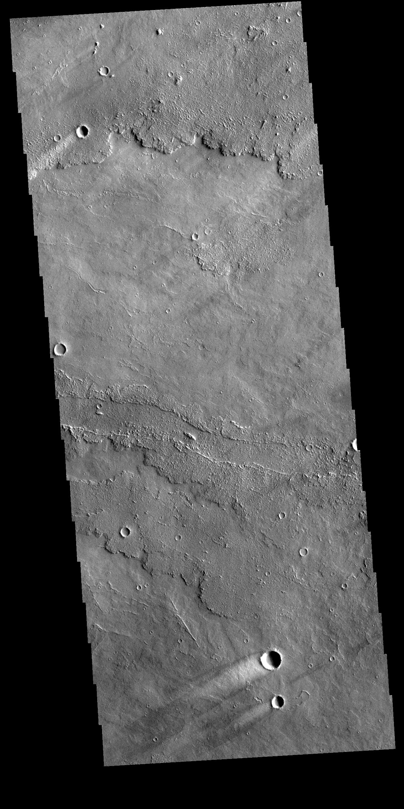 Today's VIS image shows several windstreaks on lava plains southwest of Arsia Mons. The extensive lava flow field is called Daedalia Planum.