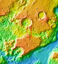 The THEMIS VIS camera contains 5 filters. The data from different filters can be combined in multiple ways to create a false color image. These false color images may reveal subtle variations of the surface not easily identified in a single band image. Today's false color image shows part of Daga Vallis on Eos Mensa.