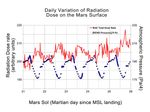 The red line indicates the total dose rate of radiation from both charged particles and neutrons, as detected by Curiosity's Radiation Assessment Detector. The blue dots represent atmospheric pressure in units of Pascal (divided by four) taken by Curiosity's Rover Environmental Monitoring Station. The atmospheric data were scaled to fit in the same plot as the radiation data.
