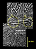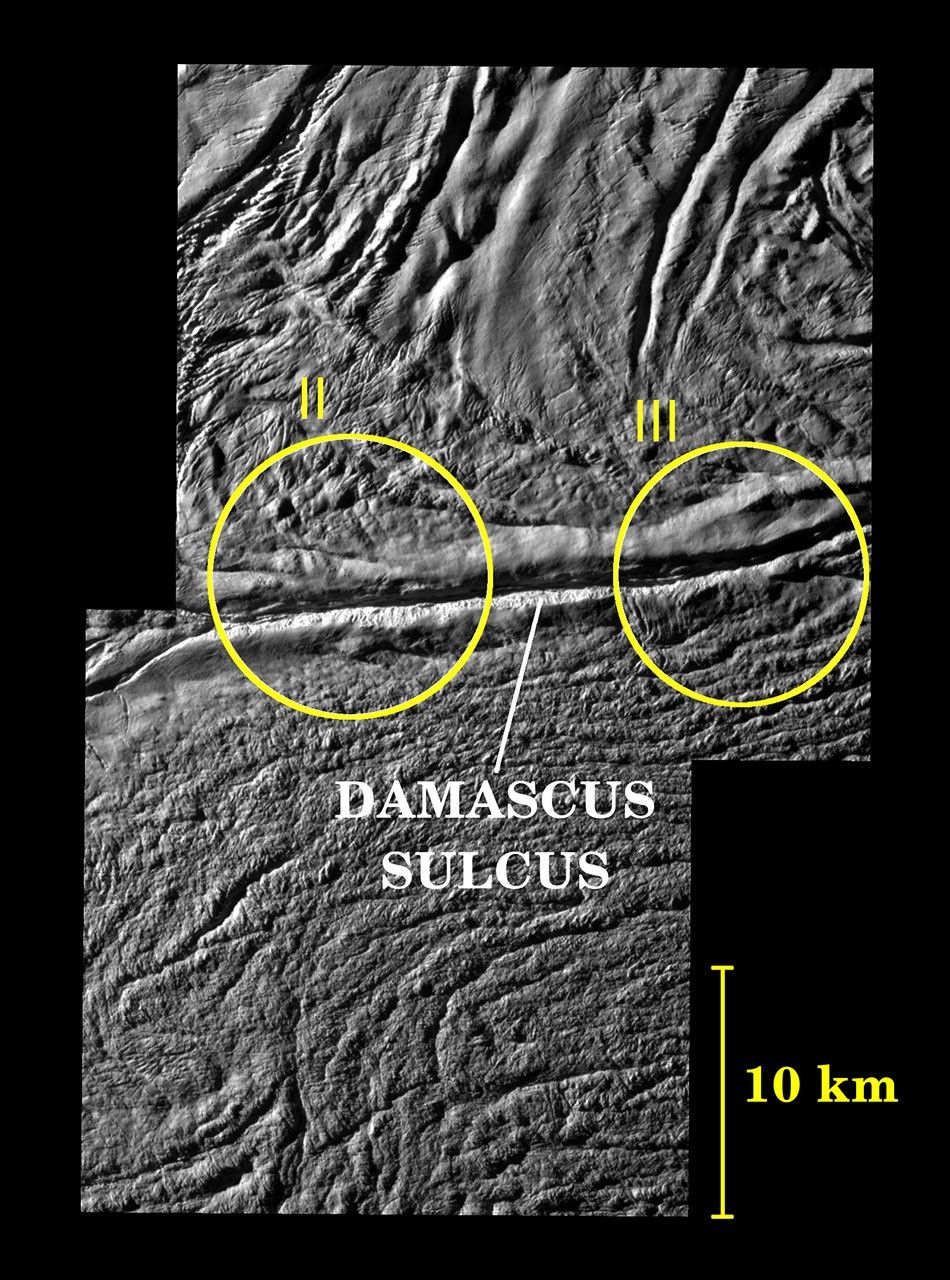 Features on Enceladus are named for characters and places from "The Arabian Nights," and the four most prominent sulci are named Alexandria, Cairo, Baghdad and Damascus. Here, Damascus Sulcus runs across the center, from left to right.
