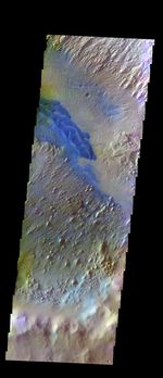The THEMIS VIS camera contains 5 filters. The data from different filters can be combined in multiple ways to create a false color image. These false color images may reveal subtle variations of the surface not easily identified in a single band image. Today's false color image shows part of the floor of Danielson Crater. This crater has deposits of material on the floor that have the appearance of wind erosion. The ridges and elongate hills are indications of wind direction. The dark blue material in this image is sand, most likely basaltic. The sand has formed dunes, but also can be seen filling small valleys to the upper right of the main dune.