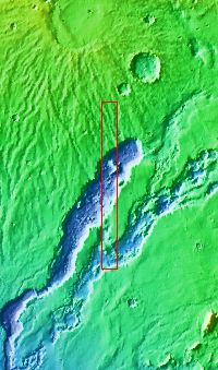 Today's VIS image shows a small portion of both Dao Vallis (middle of image) and Niger Vallis (bottom of image). Arising from the volcano Hadriacus Mons (top of image), Dao Vallis is approximately 1200km (750 miles) long. Niger Vallis is 333 km (207 miles) long. It has been proposed that heating of the region due to volcanic activity melted subsurface ice which was released to the surface to carve the two channels. Niger Vallis merges with Dao Vallis south of this image and then flow southwestward into the Hellas Planitia basin.