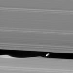 A faint, narrow tendril of ring material follows just behind Daphnis (to its left). This may have resulted from a moment when Daphnis drew a packet of material out of the ring, and now that packet is spreading itself out.