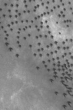 This Mars Global Surveyor (MGS) Mars Orbiter Camera (MOC) image shows north polar sand dunes in the summertime. During winter and early spring, north polar dunes are covered with bright frost. When the frost sublimes away, the dunes appear darker than their surroundings. To a geologist, sand has a very specific meaning. A sand grain is defined independently of its composition; it is a particle with a size between 62.5 and 2000 microns. Two thousand microns equals 2 millimeters. The dunes are dark because they are composed of sand grains made of dark minerals and/or rock fragments. Usually, dark grains indicate the presence of unoxidized iron, for example, the dark volcanic rocks of Hawaii, Iceland, and elsewhere. This dune field is located near 71.7°N, 51.3°W. Dune slip faces indicate winds that blow from the upper left toward lower right. This picture covers an area approximately 3 km (1.9 mi) across and is illuminated by sunlight from the lower left.