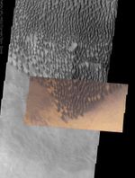 This approximately true color THEMIS VIS image shows the striking contrast between large, dark dunes and the surrounding surface. These dunes are at the southernmost edge of the Russell Crater dune field, located in the heavily cratered terrain of the southern highlands. Dust devil tracks off the eastern edge of the dune field reveal that the bright orange surface is material that can be stripped away, exposing an underlying darker surface. The gray surface to the west of the dunefield may be either a thin sand sheet or a surface preferentially stripped of the bright orange material, possibly revealing the same underlying surface that is exposed in the dust devil tracks. Bright orange areas between the dunes probably highlight areas that are protected from the wind, allowing dust to accumulate into bright orange patches.