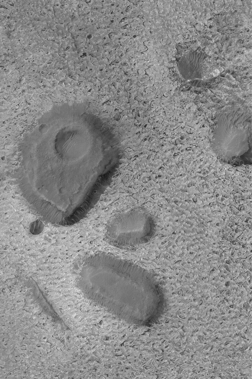 This Mars Global Surveyor (MGS) Mars Orbiter Camera (MOC) image shows several dark-toned mesas surrounded by light-toned sedimentary rock outcrops in Aram Chaos, a large impact basin -- over 200 km (more than 125 mi) across. These mesas are remnants of a once more extensive rock unit. The image is located near 2.0°N, 20.2°W, and covers an area about 3 km (1.9 mi) wide. Sunlight illuminates the scene from the left.