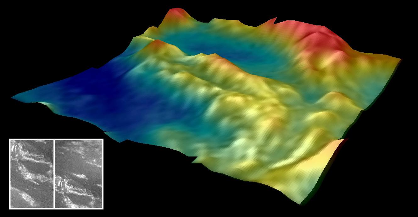 A stereo pair of images (insert) was acquired from the Huygens descent imager/spectral radiometer. The left image was acquired from 8 miles (12.2 kilometers) above the surface with the high resolution imager; the right from 4 miles (6.9 kilometers) altitude with the medium resolution imager.