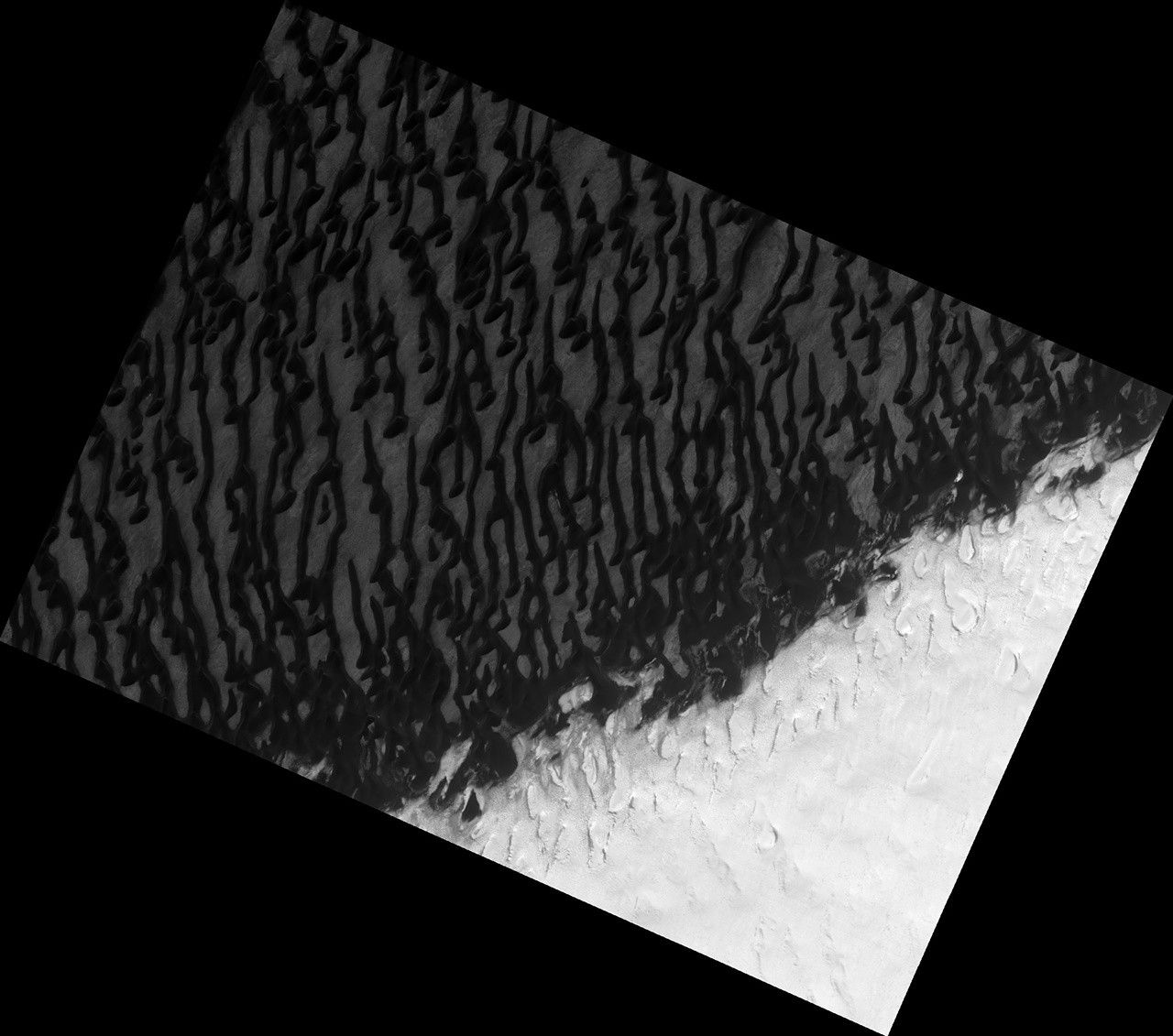 An animation compares an exact same area to how it appeared in March 2009 at the same Martian time of year. The dark sand appears to be on the move, covering much of this area that was formerly bright ice or dust-covered ice. However, this may also show year-on-year variability of seasonal processes. In other words, this area may have looked similar in 2009 a month or so after the HiRISE image was acquired. The seasonal defrosting patterns vary from year to year, perhaps depending on dust storm activity.