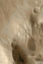 This June 2003 Mars Global Surveyor (MGS) Mars Orbiter Camera (MOC) image shows a crater rim mantled with fine dust near 7.6°N, 171.8°W. Occasional avalanches of dust have created dark streaks that are tapered at their source and broaden downslope. A suite of particularly large streaks are seen in the lower right quarter of the picture. The MOC narrow angle camera does not take color images; this full-resolution (1.5 m/pixel; 5 ft/pixel) picture has been "colorized" using data from a previous color image of Mars. Sunlight illuminates this scene from the lower left.