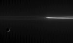 In the background, the faint G ring and brilliant F ring bound the location where Cassini entered Saturn orbit. The spacecraft passed between these two rings upon arrival in mid-2004.