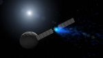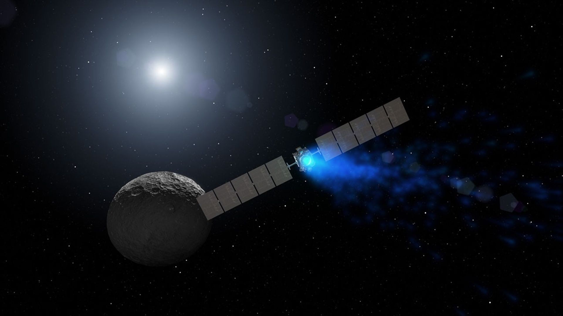 This artist's rendering shows NASA's Dawn spacecraft maneuvering above Ceres with its ion propulsion system. Dawn arrived into orbit at Ceres on March 6, 2015, and continues to collect data about the mysterious and fascinating world. The mission celebrated its ninth launch anniversary on September 27, 2016.