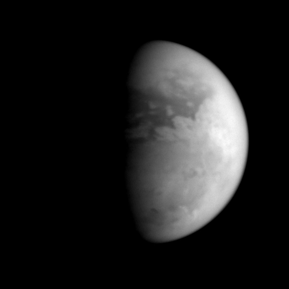 The image was taken with the Cassini spacecraft narrow angle camera on July 7, 2005, at a distance of approximately 1.3 million kilometers (800,000 miles) from Titan and at a Sun-Titan-spacecraft, or phase, angle of 60 degrees. The image was obtained using a filter sensitive to wavelengths of infrared light centered at 938 nanometers. The image scale is 7 kilometers (5 miles) per pixel.