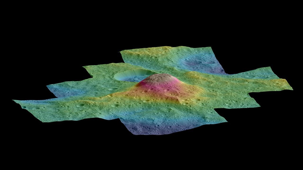 Elevations span a range of about 5.5 miles (9 kilometers) from the lowest places in the region to the highest terrains. Blue represents the lowest elevation, and brown is the highest. The streaks running down the side of the mountain, which appear white in the grayscale view, are especially bright parts of the surface (the brightness does not relate to elevation). The elevations are from a shape model generated using images taken at varying sun and viewing angles during Dawn's lower-resolution, high-altitude mapping orbit (HAMO) phase.