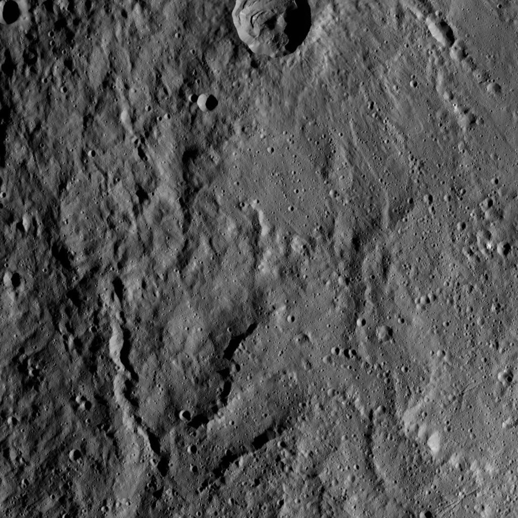This image, taken by NASA's Dawn spacecraft, shows the surface of dwarf planet Ceres from an altitude of 915 miles (1,470 kilometers). The image, with a resolution of 450 feet (140 meters) per pixel, was taken on August 27, 2015.