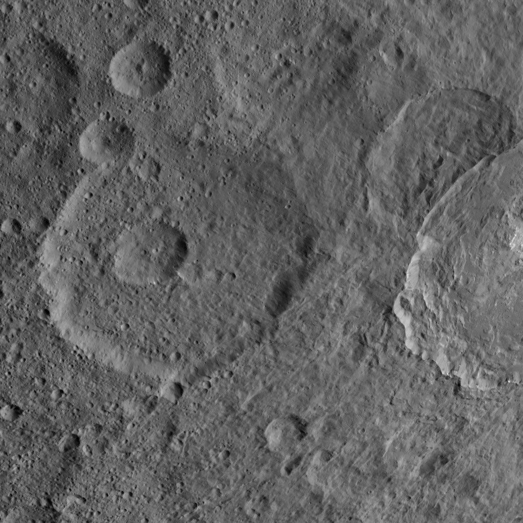 This image, taken by NASA's Dawn spacecraft, shows a portion of the northern hemisphere of dwarf planet Ceres from an altitude of 915 miles (1,470 kilometers). The image was taken on Sept. 22, 2015, and has a resolution of 450 feet (140 meters) per pixel.
