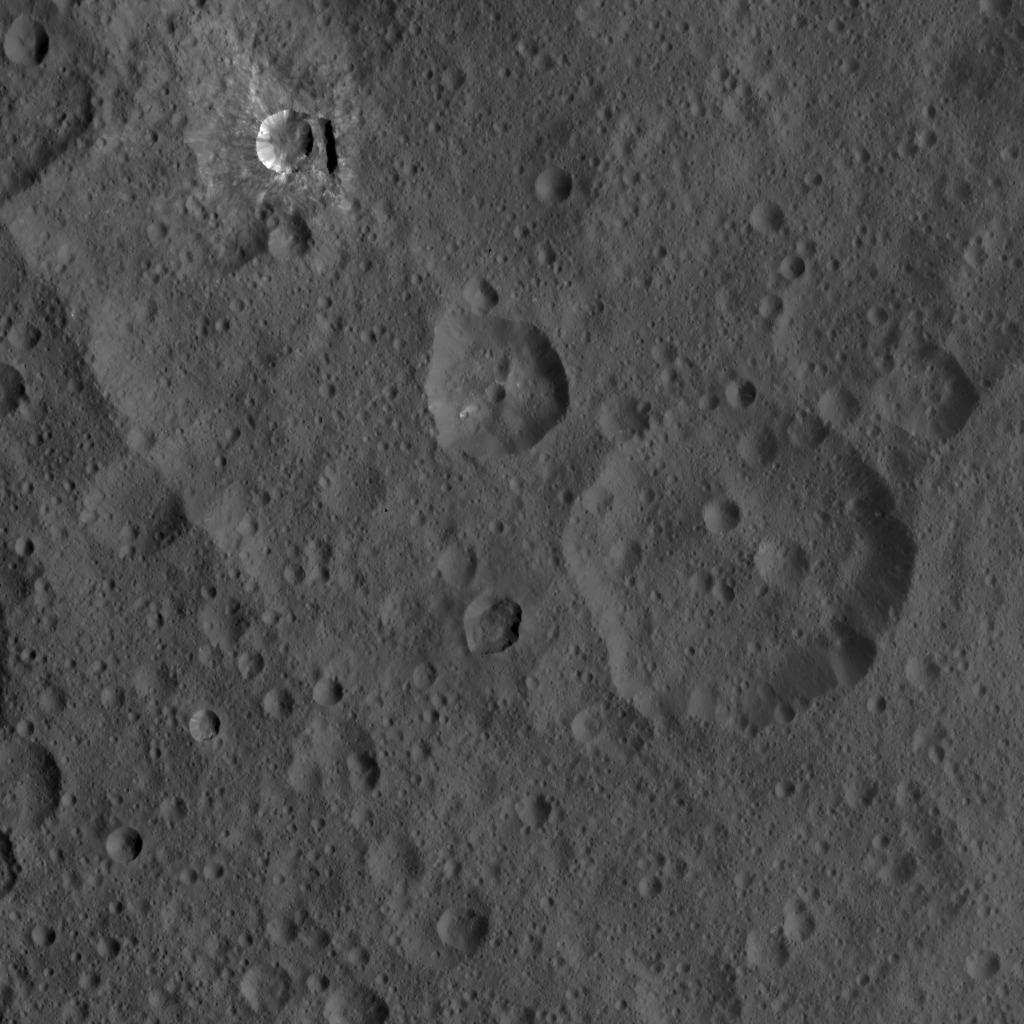 This image of Ceres, taken by NASA's Dawn spacecraft, shows three prominent craters located to the northeast of a terrace (the terrace feature being located at left in this image). The lower two craters, which are larger, have polygonal rims. The steep crater walls, distinct rim and visible ejecta of the upper smaller crater, called Oxo, hint at a fresh impact. Oxo is about 6 miles (9 kilometers) in diameter. Another interesting feature in this view is a short, linear slump, where a mass of material has dropped below the surface, to the east (or right in this view) of Oxo.