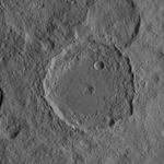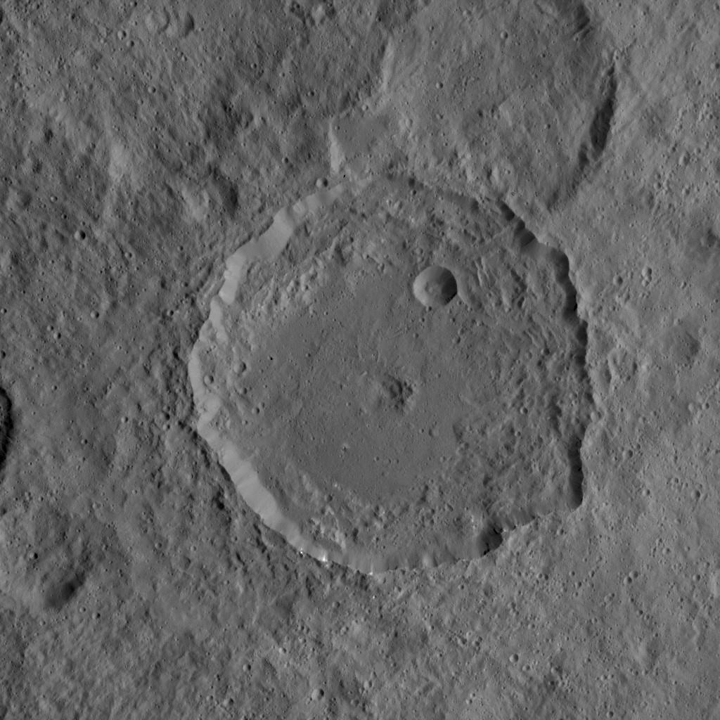 This image from NASA's Dawn mission shows the 52-mile-wide (84 kilometer-wide) crater on Ceres named Gaue. This medium-sized basin has a relatively fresh rim with terraced walls and a smooth floor. In the center of the crater are remnants of an ancient central peak, which has collapsed to a central pit. Impact ejecta from Gaue has coated the surrounding terrain, muting the appearance of older features.