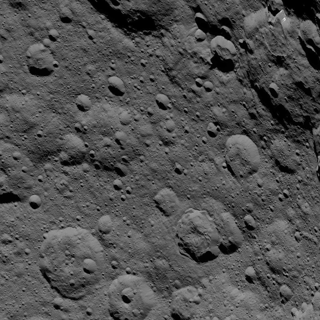 This image of Ceres, taken by NASA's Dawn spacecraft, shows cratered terrain at high northern latitudes. Dawn acquired the view from an altitude of 915 miles (1,470 kilometers) during the mission's High Altitude Mapping Orbit (HAMO) phase on Oct. 20, 2015. Image resolution is 450 feet (140 meters) per pixel.