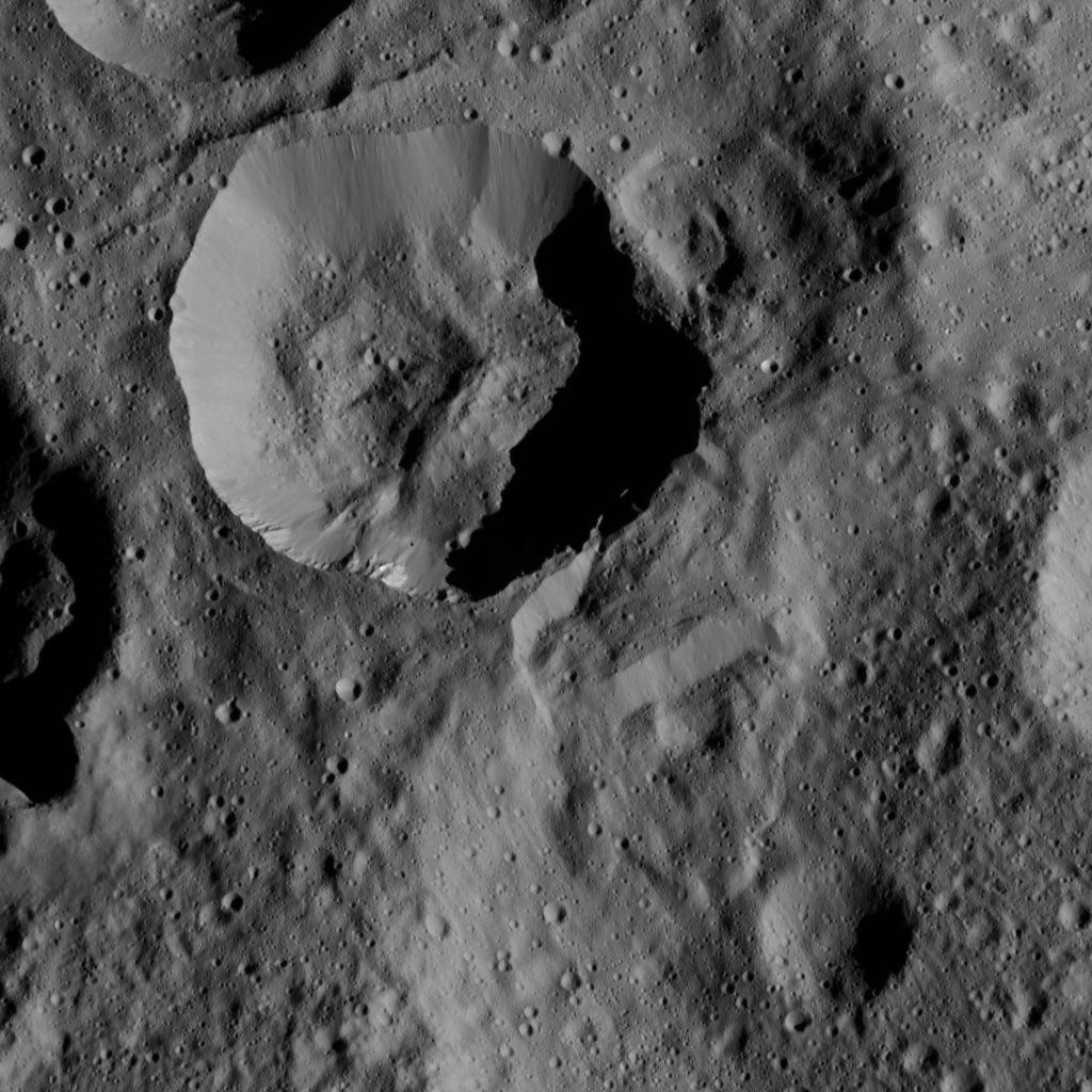 The view is centered at approximately 65 degrees north latitude, 131 degrees east longitude. NASA's Dawn spacecraft took this image on April 21, 2016, from its low-altitude mapping orbit, at a distance of about 240 miles (385 kilometers) above the surface. The image resolution is 120 feet (35 meters) per pixel.