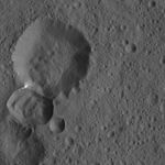 Two adjoining craters on Ceres are featured in this image from NASA's Dawn spacecraft. A lobe-shaped feature is prominent in the larger crater's interior. Bright material is visible at the intersection of the two craters.